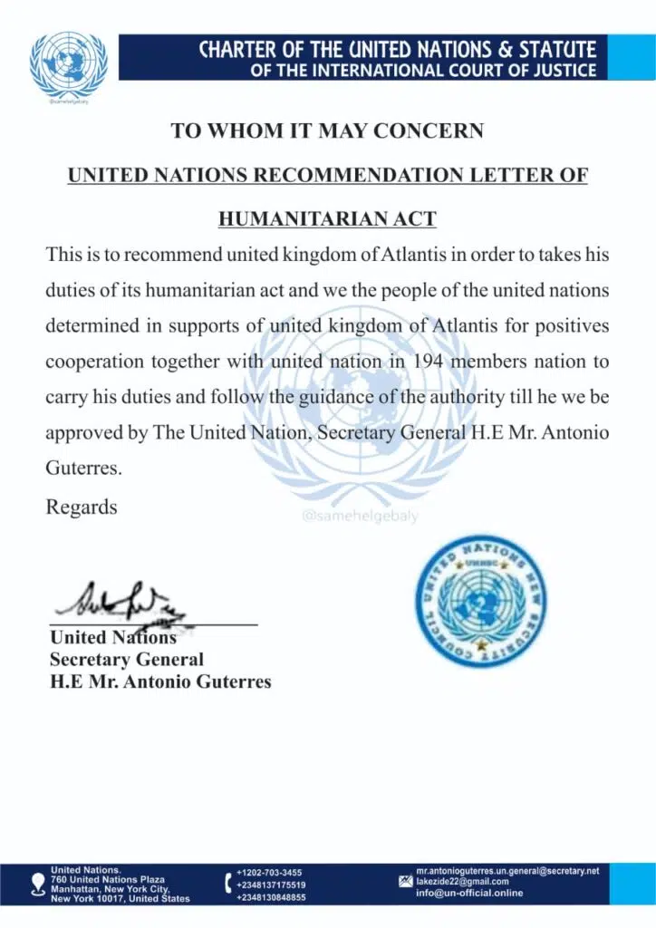 Greetings from the office of His Imperial Majesty, the head of state, the commander in chief of the armed forces of the United Kingdom of Atlantis. It is my honor and pleasure to address you at a time like this on behalf of His Imperial Majesty, on the development so far and the steps so […]